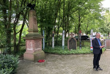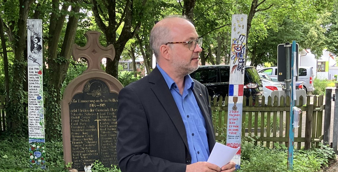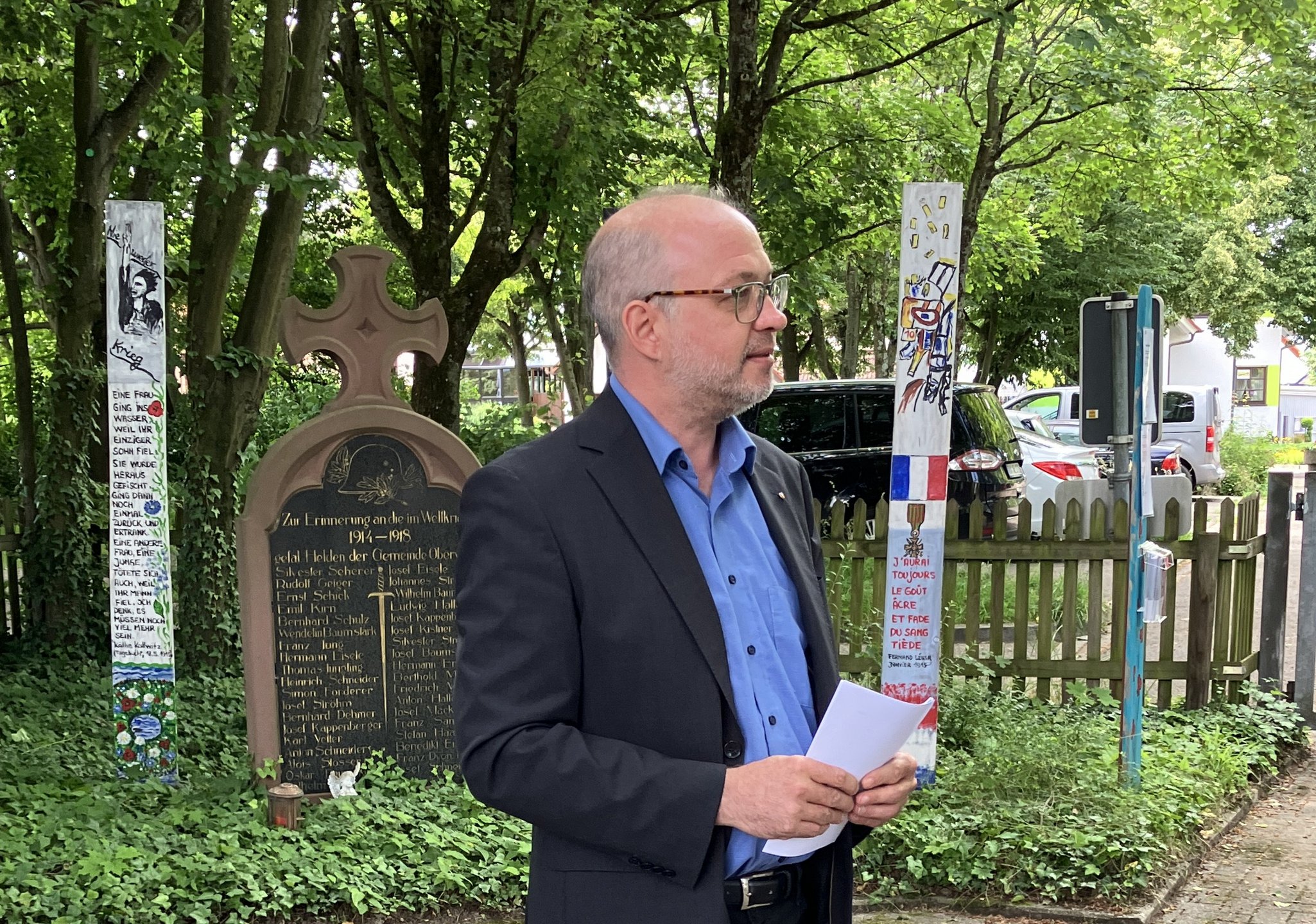 Karlsruhe / Gaggenau. 11.06.24 Am späten Vormittag eröffnete Bürgermeister Andreas Paul die Ausstellung „Nie wieder Krieg“ von Bali Tollak auf dem Friedhof in Gaggenau- Oberweier. Paul betonte in seinen einführenden Worten u.a. den „leider zeitlosen Charakter“ der Kunstwerke.