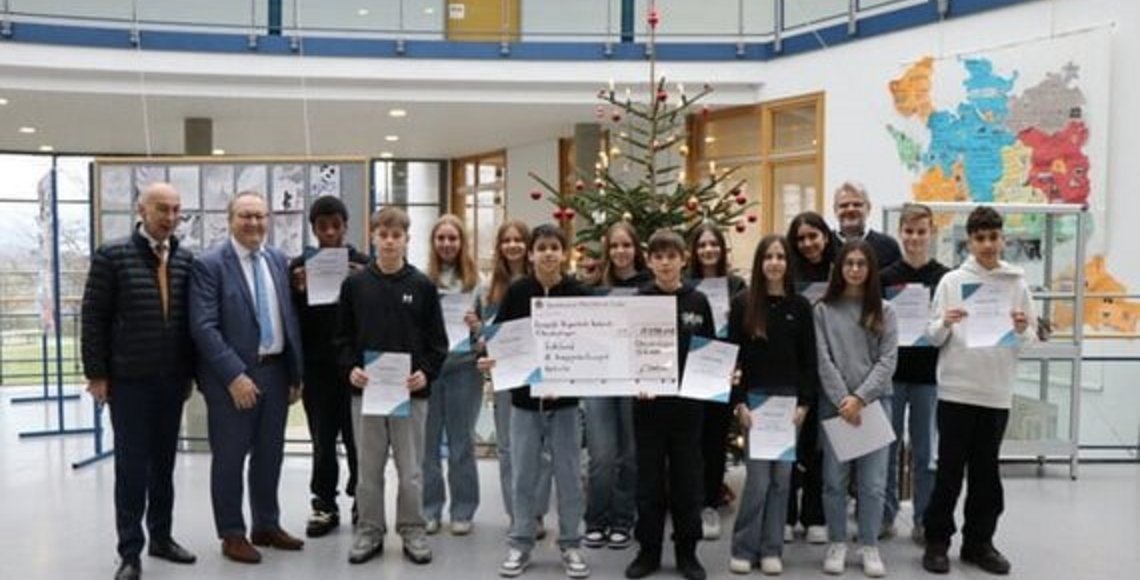Karslruhe, Oberderdingen 13.12.24. 14 Schülerinnen und Schüler der Klassen 8b der Leopold-Feigenbutz-Realschule Oberderdingen haben im vergangenen Oktober und November an der Haus- und Straßensammlung für den Volksbund Deutscher Kriegsgräber teilgenommen. Der 1. Vorsitzende des Bezirksverbandes Nordbaden Dr. Martin Michel dankte zusammen mit Bürgermeister Thomas Nowitzki den Schülerinnen und Schülern für ihr Engagement wie auch dem Schulleiter Gregor Svoboda, der die Sammlung ermöglichte.