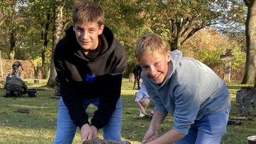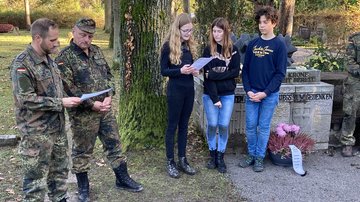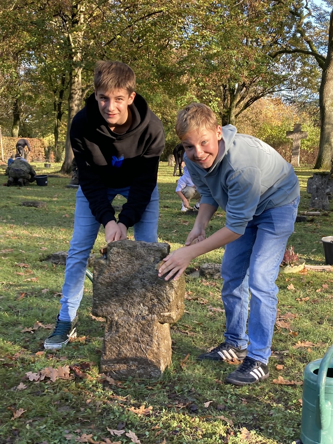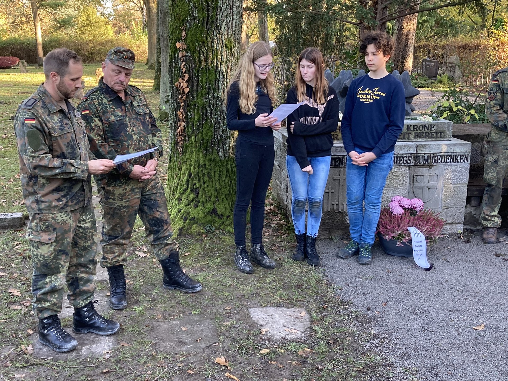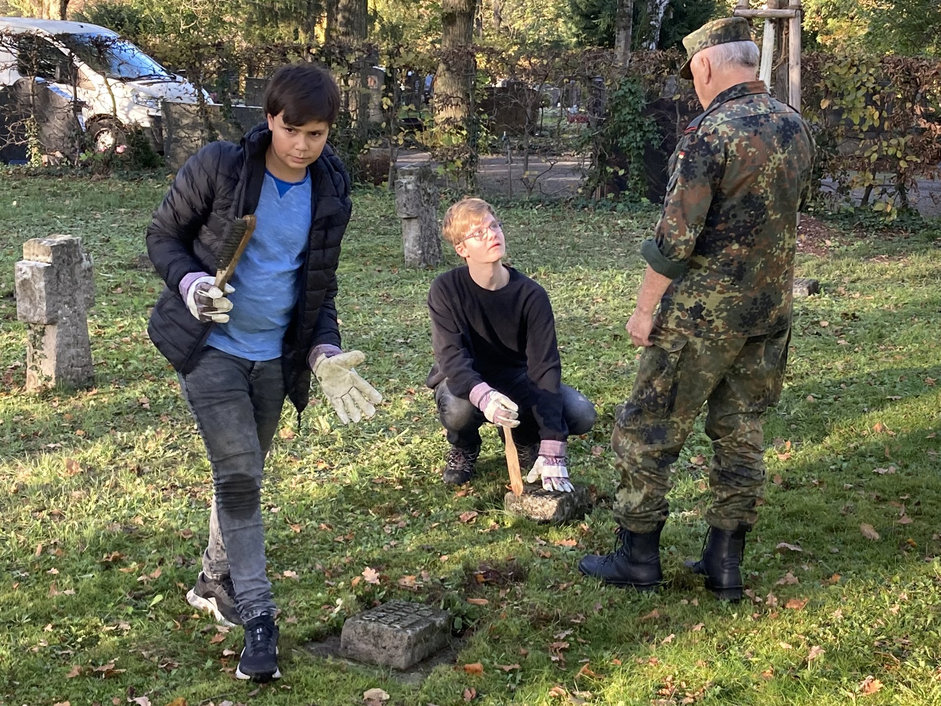 Mit sehr großem Eifer säuberten alle Beteiligte die mit Moos bewachsenen Grabsteine. Mit dieser gemeinsamen Pflegearbeit wurde erreicht, dass diese Kriegsgräberstätte weiterhin als Ort des Gedenkens und der würdigen Erinnerung bestehen bleibt. Zudem wurde durch das Arbeiten an den Grabsteinen den Teilnehmenden vor Augen geführt, in welch jungem Alter zum Teil die dort Bestatteten durch den Krieg getötet wurden. Damit wurde auch der Bogen zu den heutigen Kriegen und ihren Folgen gespannt. Der russische Angriffskrieg auf die Ukraine führt deutlich vor Augen, dass das Engagement für Frieden, gegen Gewalt und Krieg nicht nachlassen darf. Der gewünschte Austausch zwischen den drei Gruppen (Schülerinnen, Bundeswehr und Reservisten) über der Arbeit an den Gräbern zum Thema Krieg und Frieden kam nicht so recht in Gang. Dafür war die gegenseitige Hilfe bei der Arbeit sehr hoch.